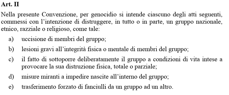 “Ciascuno degli atti seguenti, commessi con l’intenzione di distruggere, in tutto o in parte, un gruppo nazionale, etnico, razziale o religioso: uccisione di membri del gruppo, lesioni gravi all’integrità fisica o mentale di membri del gruppo, il fatto di sottoporre il gruppo in maniera deliberata a condizioni di vita intese a provocarne la distruzione fisica, misure miranti a impedire nascite all’interno del gruppo, trasferimento forzato di fanciulli”.